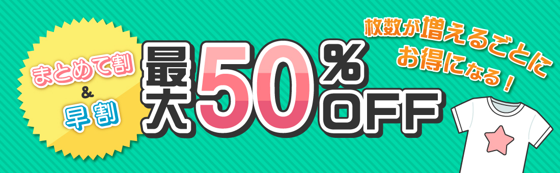 当店ではより多くのお客様にオリジナルTシャツプリントをお試しいただく為、【早割】【まとめて割】を実施しています。